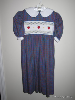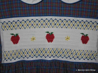 Well, it's back to school week at Mommy's Apron Strings and today I am sharing these dresses that my girls wore for their first day of school when Rosie started preschool and Katie started first grade. The dresses are Imperial tartan plaids, Rosie's in red and Katie's in blue. They have piping on the collar and cuffs and are hand smocked with a design that I believe was in an old issue of Sew Beautiful (but I'm not sure).