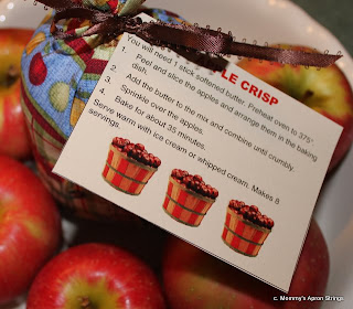 They have a ceramic pie plate, apples, and a mix the girls made for topping. The mix is in a plastic bag inside these pretty fabric bags the girls made. A tag with directions is tied on with a ribbon. Here's a close-up of the pretty tags: