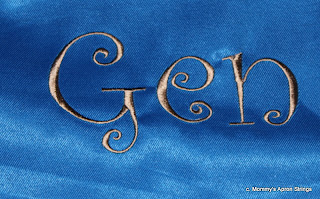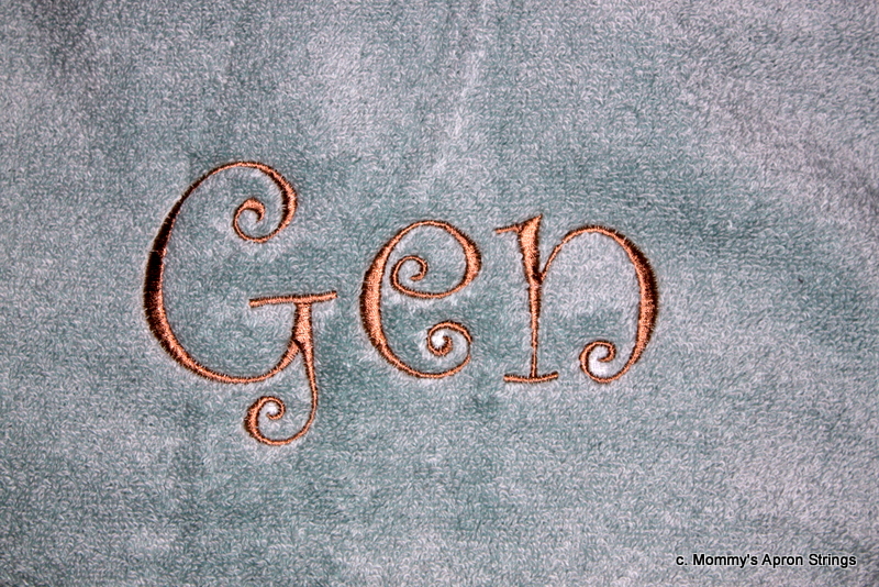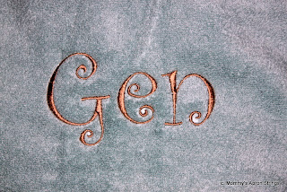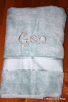 The bath sheet was a beautiful soft blue-green (the picture doesn't do it justice) and since I didn't have embroidery thread for a tone-on-tone look, I used tan. I used the same thread and font on the laundry bag (below) which was "Curlz" 4" from 8 Claws and a Paw.