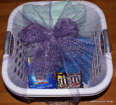 We filled a small laundry basket with the towel, laundry bag, a package of all-in-one detergent and softener sheets, & a big bag of M&Ms.