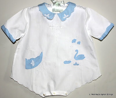 This romper is so sweet. It has a blue collar and cuffs. There is a Madeira appliqued swan and a little shaped pocket. The collar, cuffs, and sleeves are edged with hand-worked scallops. In fact, everything on this romper is stitched by hand. It has no tag, so I don't know if it was homemade or purchased. It looked so sweet on him, even if everyone thought he was a girl! Continue down for detail pictures and one of Andy wearing the romper. Back soon with more. I'm planning to share some American Girl clothes and antique patterns. Thank you to the friends I met this week through email. I'm sorry it took me awhile to answer you, but I was thrilled to hear from you!! Linking this post to White Wednesday at Faded Charm.