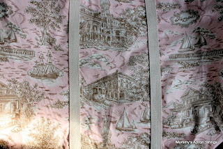 Here's the prototype I started with. This is a beautiful "town toile" for Tampa, Florida. I found it at a discount store for $1.99/yd!! This bag is larger, more for the beach. I didn't buy enough webbing, so the straps end at the side, rather than going underneath. This one needs a little sturdy plastic to line the bottom.