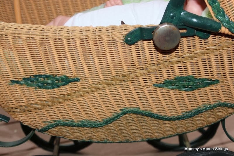 I was very excited to spot this doll buggy at a yard sale I drove by last weekend. Of course, I turned the car around to check it out. It is adorable and in excellent condition! The wicker is perfect, the hood moves, and the seat can sit up or lay flat!