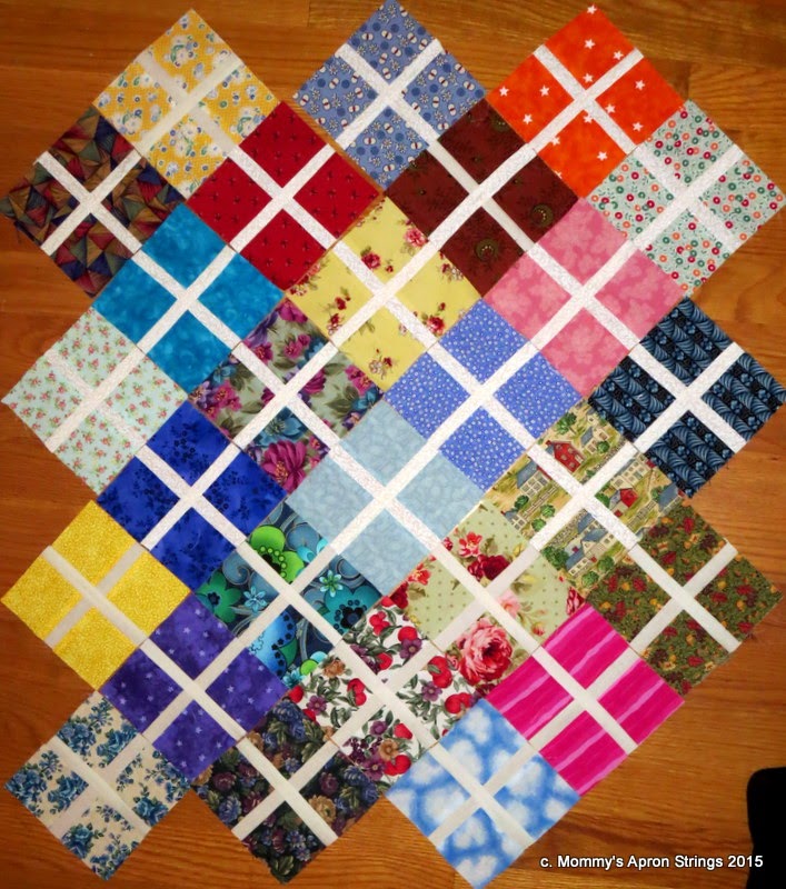 Here are all of my blocks, laid together. We are going to mix them all up before we stitch any together. The strips in between the 4-patches are muslin.