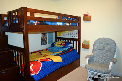 The bunkbed is not new, but Santa brought new bedding for both boys: Davy has Star Wars and Andy has Pokemon. The book baskets on the wall are new. Andy's clothes moved from the babyish changing table to the drawer-steps on the bunk bed.