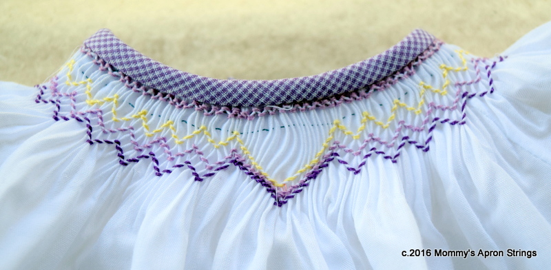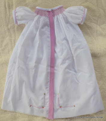 Then I added a lavender gingham neckband and hem. The tiny sleeves have Swiss edging and elastic. I am planning to add a tiny crocheted pansy to the center front of the smocking if I can find a pattern.