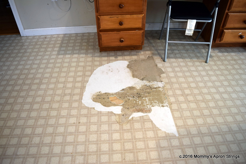 BEFORE:  The floor was an inexpensive vinyl from 14 years ago when we built the house. It had lost its shine and was scratched, dented, and grubby. The area by my desk had peeled and kept getting worse.