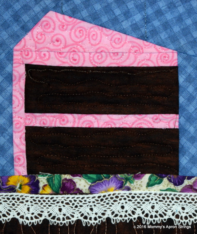 The pie is Key Lime and the cake is Carrot Cake. I have tried both of these and the Carrot Cake is absolutely scrumptious! I paper-pieced the cake and pie slices from free patterns online. Paper-piecing is my absolute least favorite quilting technique. I always put the pieces to the wrong side of the stitching line, so when I flip it it's too small. I had to fix that pie a few times! I tried to add dishes under the treats, then quilted a "wood grain" on the table and added a lace tablecloth. You got that, right??
