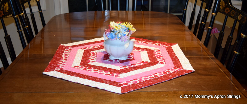 This table topper is easily made by sewing strips together in a long piece, then cutting 60 degree triangles from it and flipping every other one so they form a hexagon. I didn't take pictures of the process. I like how both pink rows matched up with themselves to form rings.