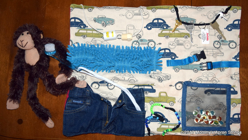 I made mine geared towards a man. It has the front of kids jeans with buttons, zipper, and pockets. There is a cottony mop head, a plumbing pipe that can be screwed together, keys on a string, a dog collar buckle, and marbles sealed in screen.