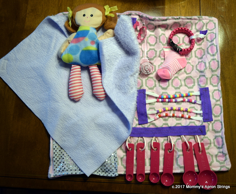 Above is Katie's quilt. She made one for a woman and incorporated a baby sock filled with marbles, a clip bracelet, beads on shoelaces, and a soft doll with a swaddling blanket and a little brush. There is a mirror-like piece of silver sequin fabric. Oh, yes, also some rattly measuring spoons! Hers is on flannel with a fleece backing.