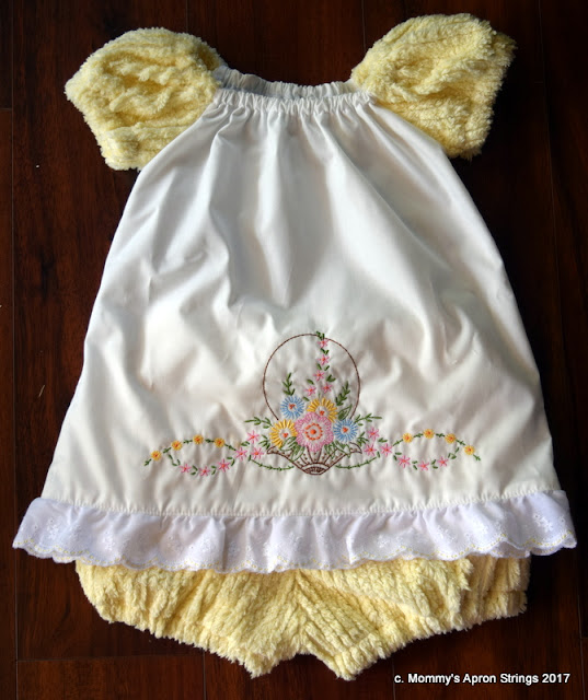 Here is one of my recent creations. I found a large piece of yellow chenille at a thrift shop when we were at the beach. It inspired me to try this combo I had seen awhile ago. Someone made a peasant dress using a vintage embroidered pillowcase with the chenille sleeves.