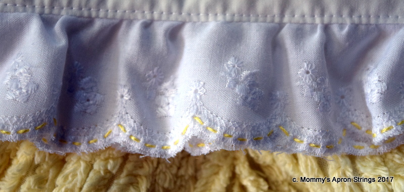 The white is poly/cotton broadcloth, because I didn't want it to need ironing. The eyelet is an inexpensive poly/cotton as well. I usually prefer the Swiss, but I intended this to be playclothes, so I wanted to keep it easy care. Can you see how I wove yellow floss through the holes in the trim? I love that little touch, though it is hard to see.