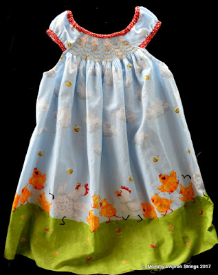 This fun smocked dress was an online class offered by Maggie Bunch. The pattern is called "Ode to Joy" and I liked the different neckline, which is elastic and doesn't need snaps or buttons. The dress was intended to teach matching border fabrics in a circle. I ordered this chicken print from fabric.com because I love chicken-y things since we have them for pets. I agonized way too much over the co-ordinate for the neckline, but I do love the red dot I chose.