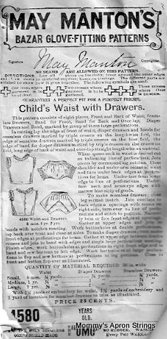 Here is a May Manton's pattern for a child's waist with drawers. I am always amazed by the amount of work involved in buttoning on toddler's underwear!